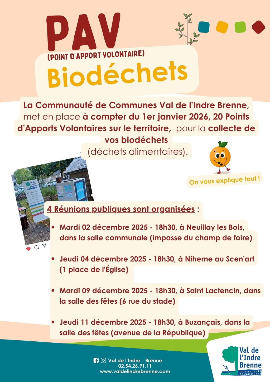 4 réunions publiques sont prévues au mois de décembre pour la mise en place des PAV (point d'apport volontaire) pour la collecte des biodéchets, à compter du 1er janvier 2026 :