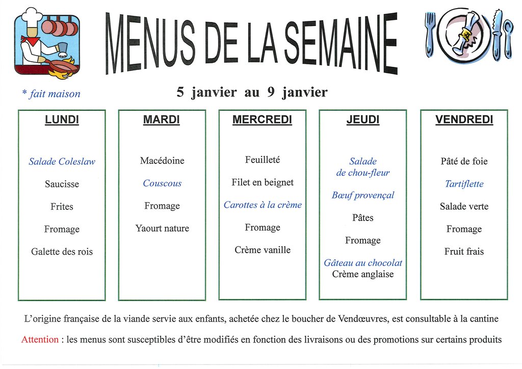Menus de la semaine du 5 au 9 janvier 2026