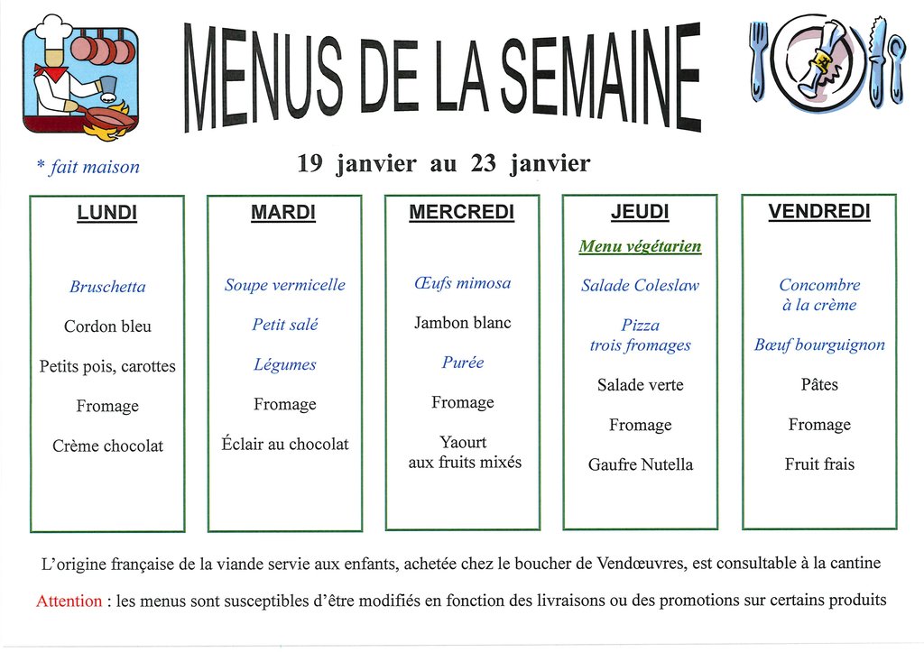 Menus de la semaine du 19 au 23 janvier 2026