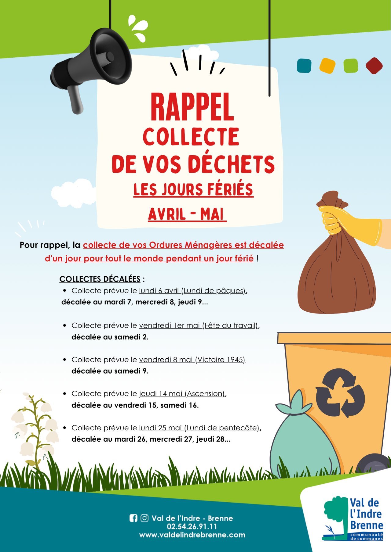 La collecte des ordures ménagères est décalée d'une journée lorsqu'un jour férié tombe dans la semaine :