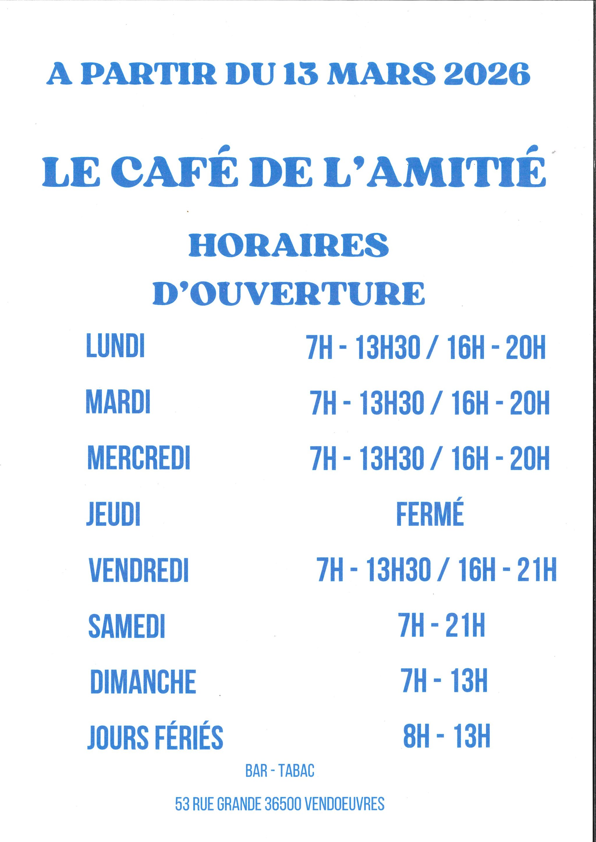 Pour raison de santé, à partir du 13 Mars 2026 les horaires sont modifiés.